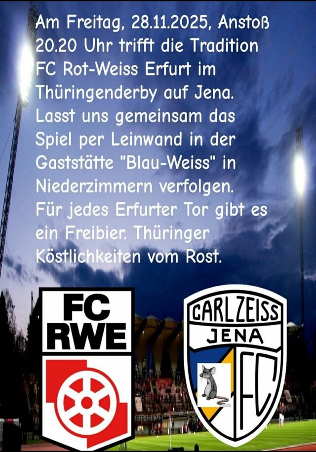 Willkommen auf der Website der Gaststätte Blau-Weiss Niederzimmern. In unserem Haus erwartet Sie eine Auswahl an regionalen Gerichten die unser Koch ganz traditionell zubereitet. Genießen Sie mit ihrer Familie, Freunden oder Bekannten ein paar Stunden bei gutem Essen und verschiedenen Getränken.